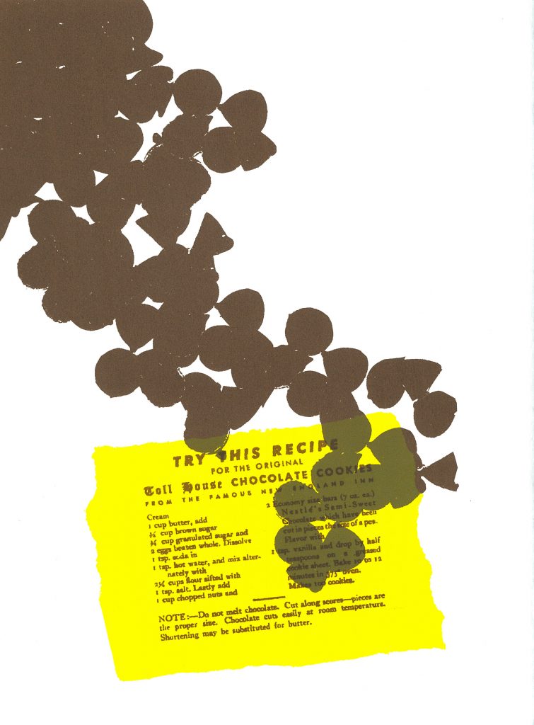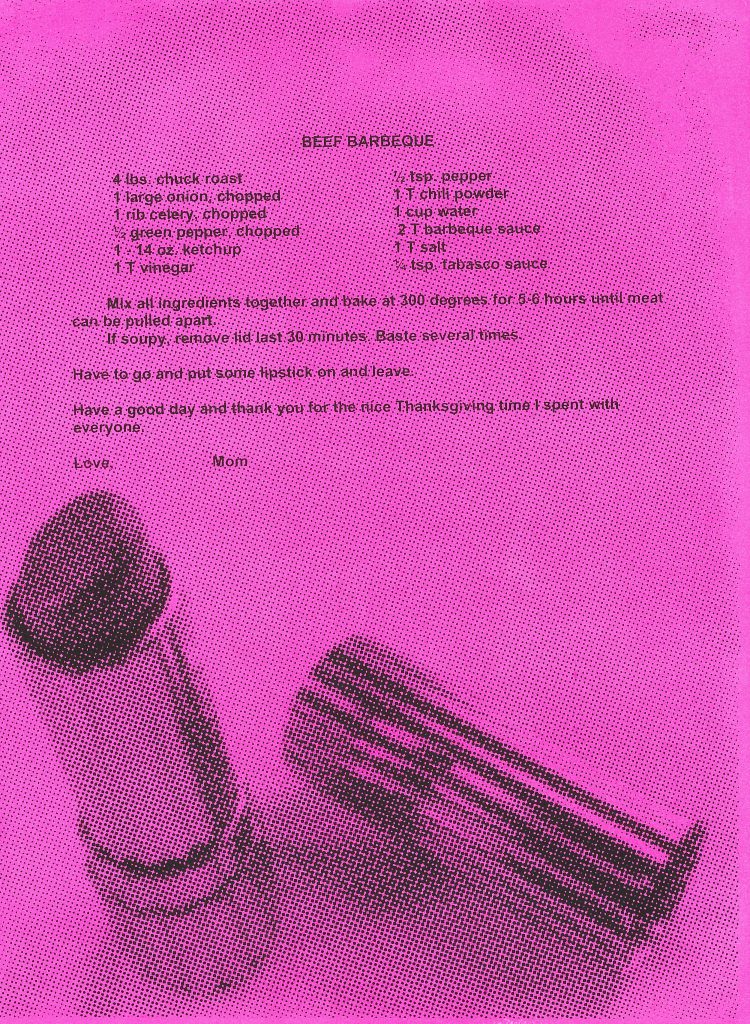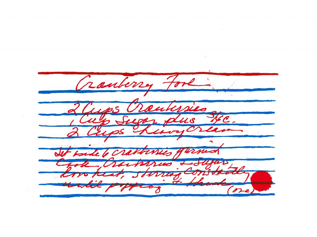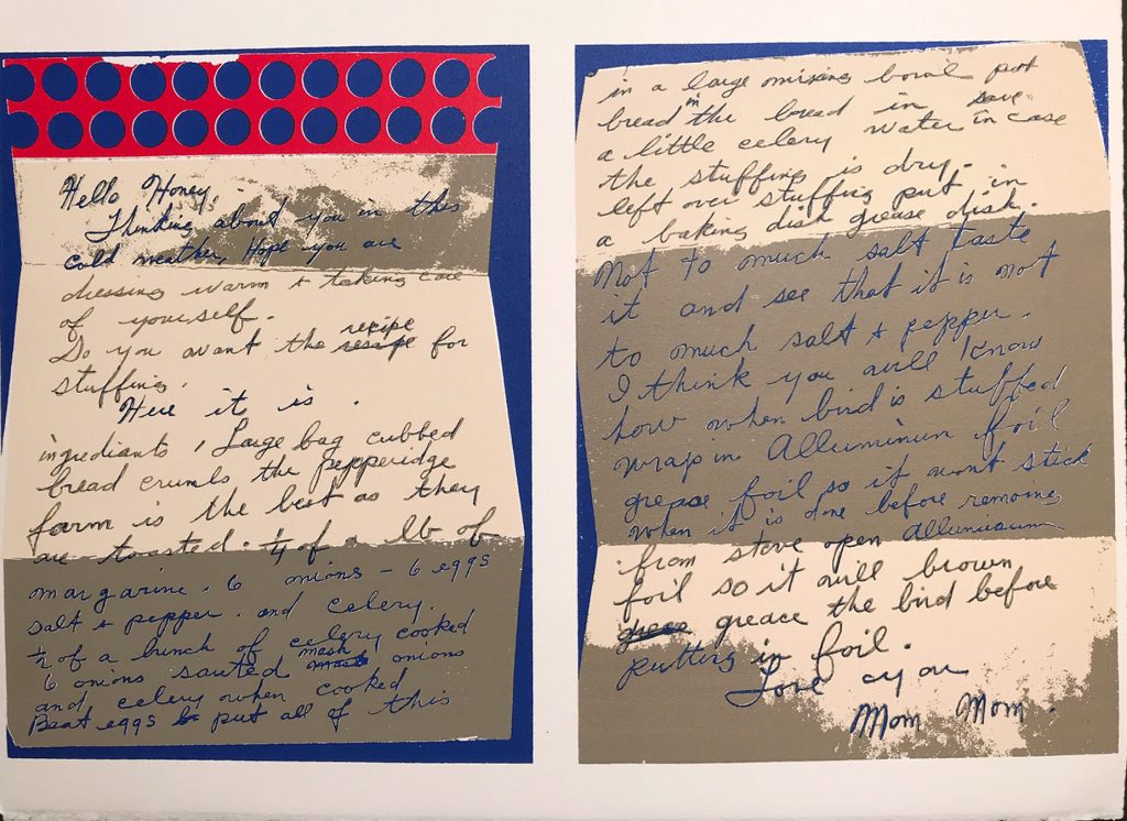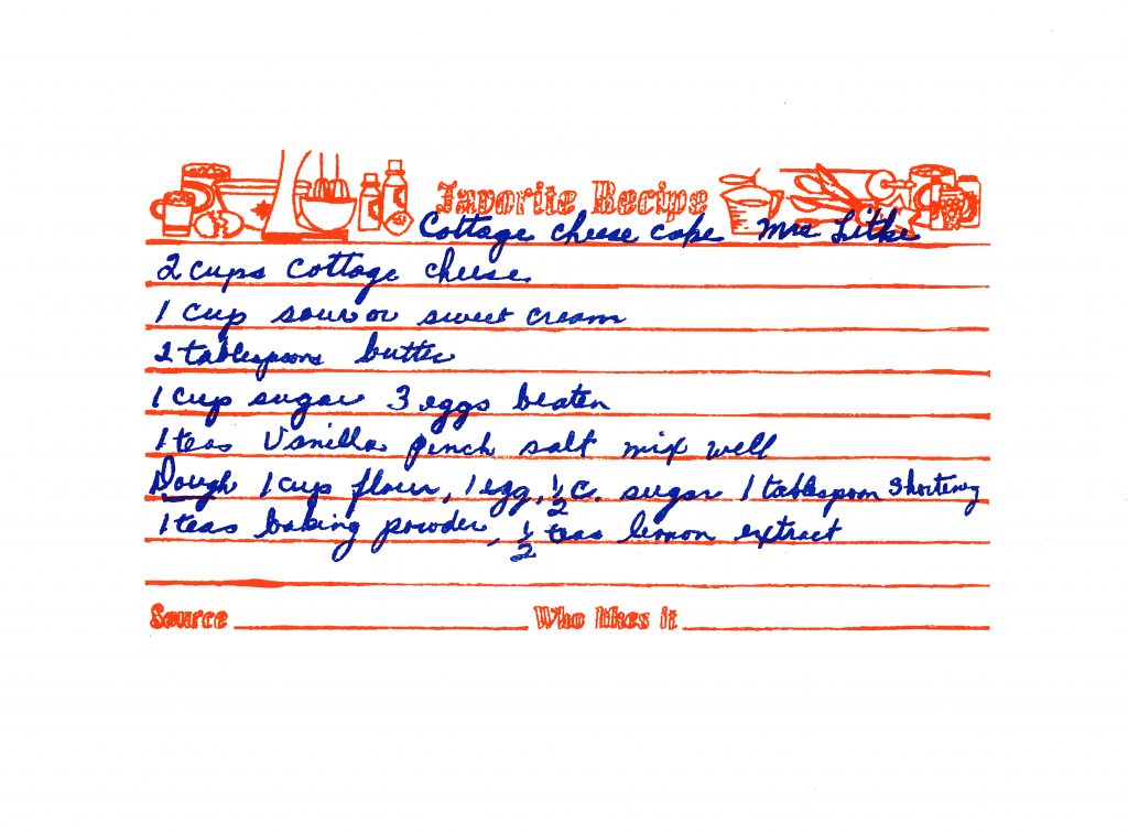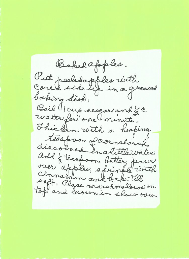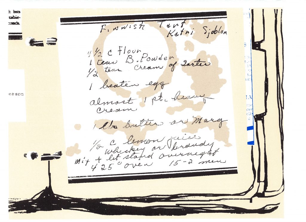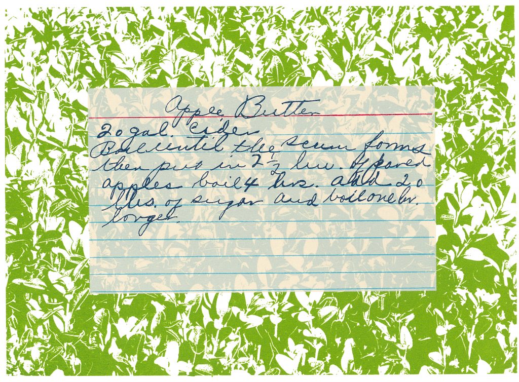 Screen-prints in this series are based on recipes given to Wolf Newlands by friends, family, and acquaintances. All of the recipes are associated with an important memory or experience. The artist’s transcribed recipes-as-artworks were on exhibit as part of Wolf Newlands’ 2018-19 “Keeping House” exhibition at the Southern Alleghenies Museum of Art in Altoona, Pennsylvania. The stories associated with making and/or eating that food were compiled into a cookbook/catalog which is available at the Museum. The artist’s brother Peter Wolf wrote this essay for the catalog: