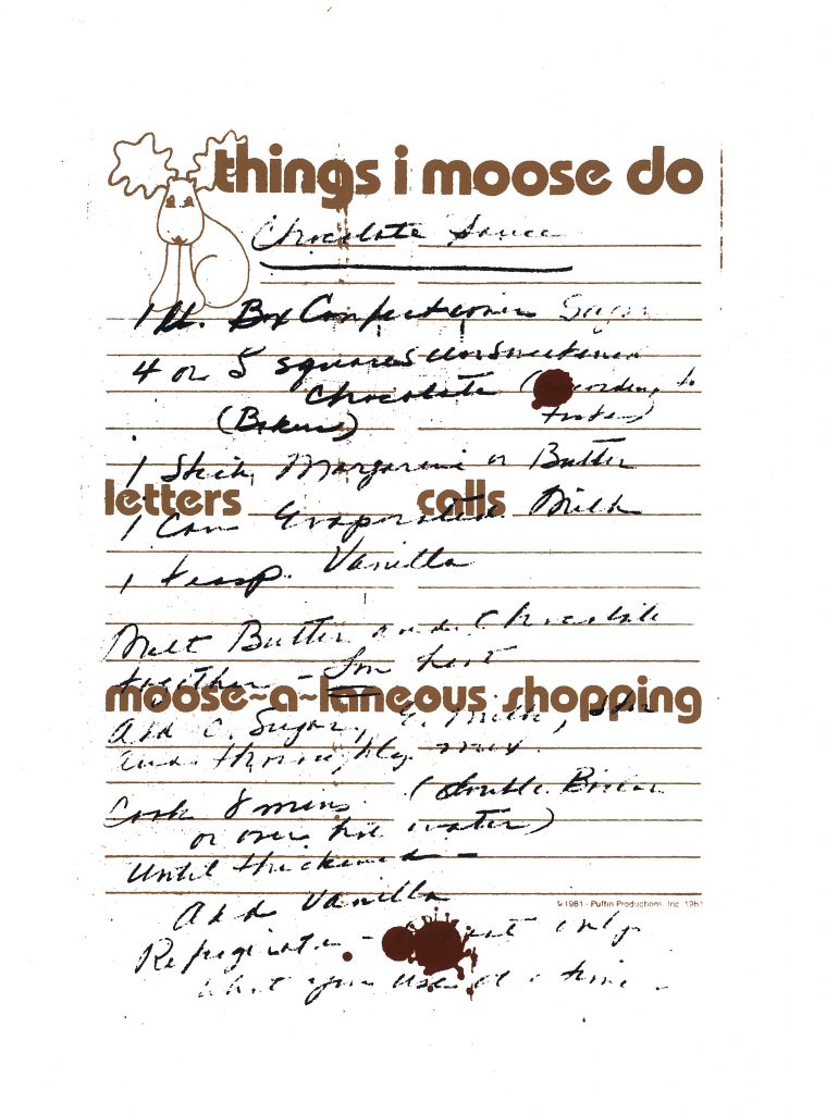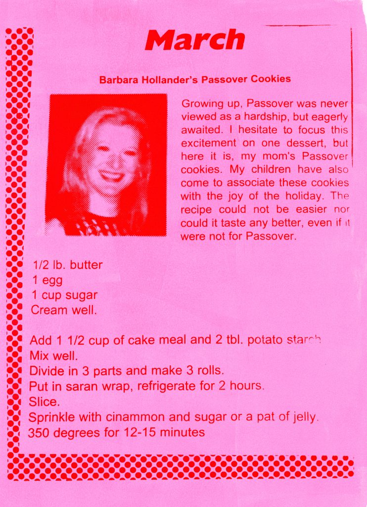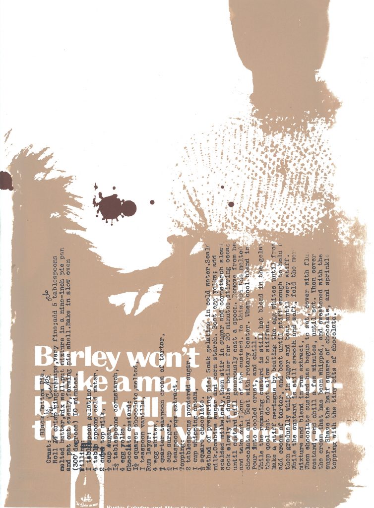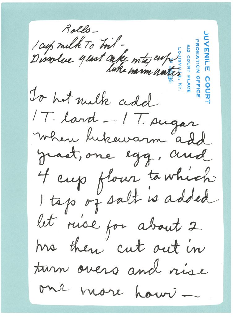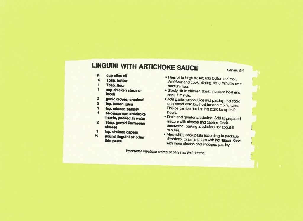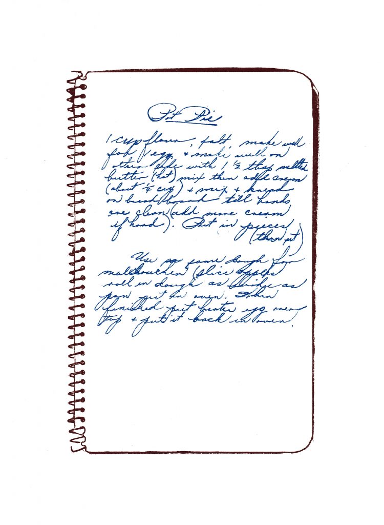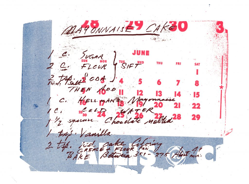 Screen-prints in this series are based on recipes given to Wolf Newlands by friends, family, and acquaintances. All of the recipes are associated with an important memory or experience. The artist’s transcribed recipes-as-artworks were on exhibit as part of Wolf Newlands’ 2018-19 “Keeping House” exhibition at the Southern Alleghenies Museum of Art in Altoona, Pennsylvania. The stories associated with making and/or eating that food were compiled into a cookbook/catalog which is available at the Museum. The artist’s brother Peter Wolf wrote this essay for the catalog: