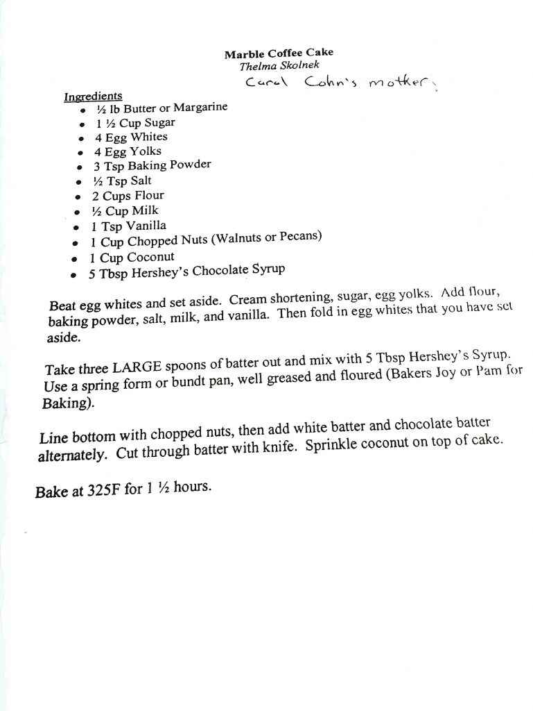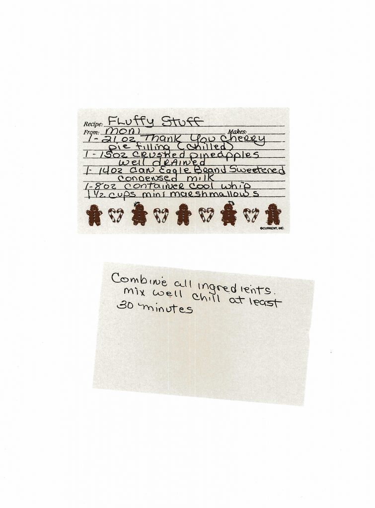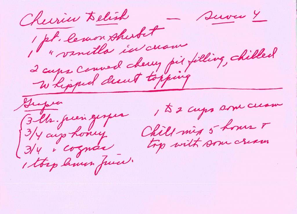 In conclusion, in Recipe, I can imagine a completed human life—perfected in another sphere of existence—a Great banquet! Here we will meet our cherished elders, there will be cheese balls, scotcher-roos, Bul Go Ki, Passover cookies and rum balls. There will be oven stew, mushroom and onion quiche, golden fried chicken, cranberry fool, fluffy stuff there will be tea drinking and other libations. We will all raise a toast for the living and the dead and ask for God’s blessing over such a distinguished crew of guests! And we will be immensely thankful for ever and ever.