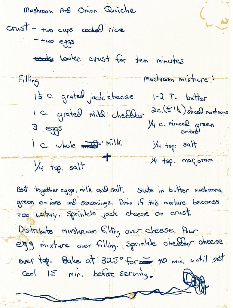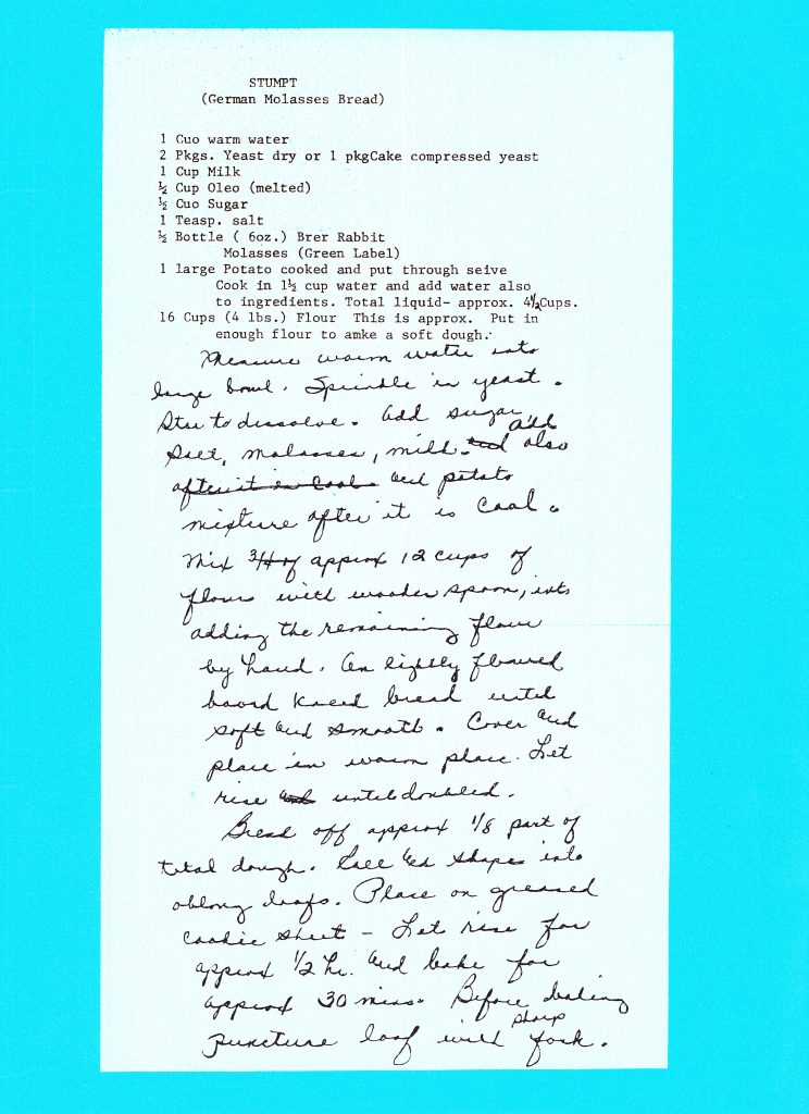It is not surprising that the crucial spark which set this artwork into motion was an heirloom—(cf “Peggy’s Roll Recipe”) handwritten by Bracken Hobson, the artist’s maternal grandmother. Other recipes in this book testify to unique events which were ‘embedded’ in a brief recipe. For example, see Charles Leiden’s Mushroom and Onion Quiche. Consider then, Charlie’s daughter Hannah’s Stumpt which further entangles new family lineages. Courtship, marriage, childbearing, and the hearth as the natural domain of human beings.