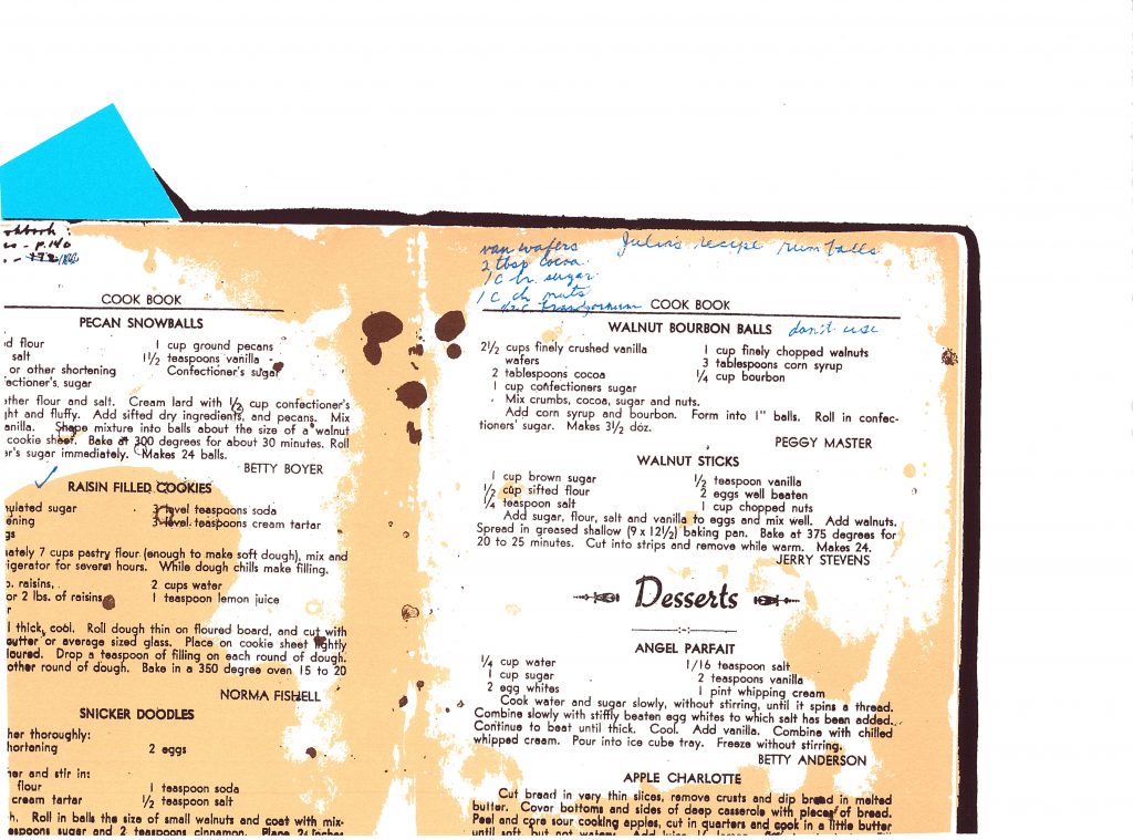 The recipes reveal a hand me down tradition as is evidenced in nearly every recipe—perhaps future genealogists and anthropologists will use this book to decipher family trees. Note also that this has tended to be a maternal preoccupation as the narratives set forth. But not in every case!